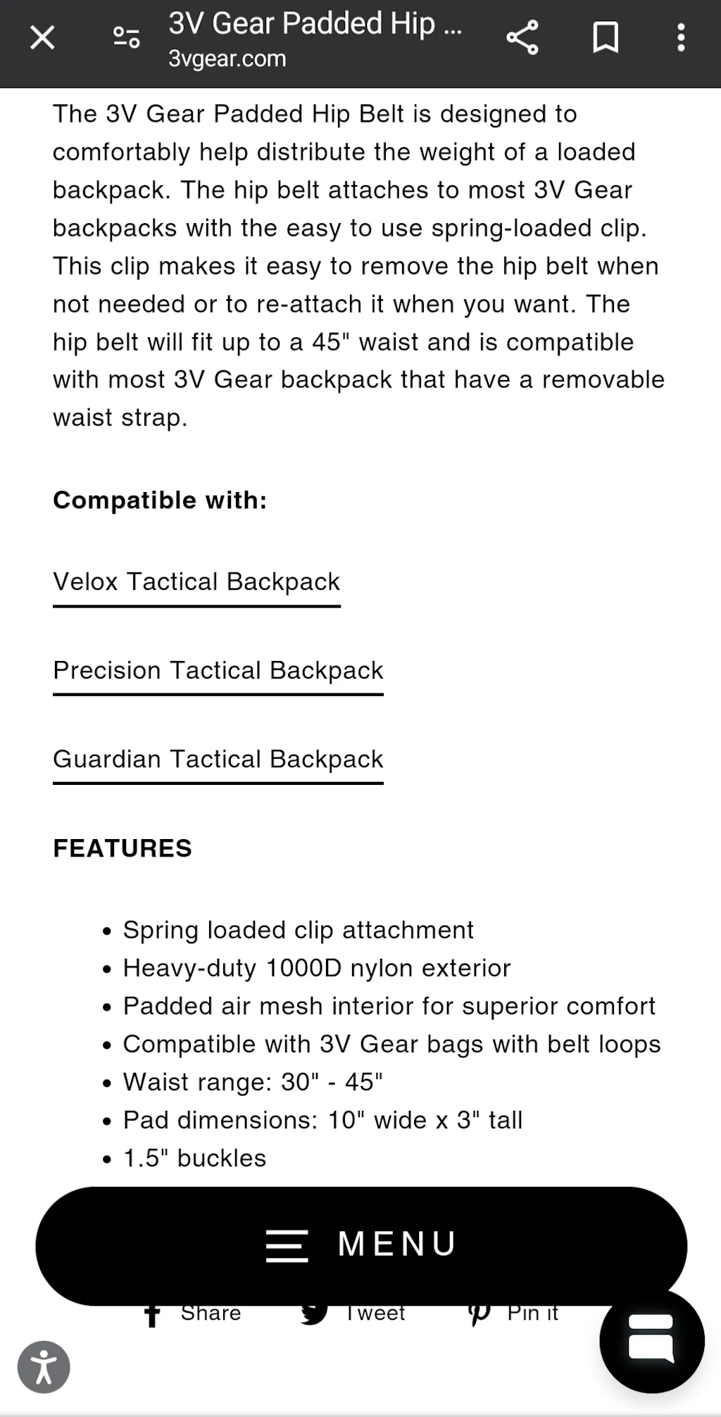 The 3V Gear Padded Hip Belt is designed to comfortably help distribute the weight of a loaded backpack. The hip belt attaches to most 3V Gear backpacks with the easy to use spring-loaded clip. This clip makes it easy to remove the hip belt when not needed or to re-attach it when you want. The hip belt will fit up to a 45" waist and is compatible with most 3V Gear backpack that have a removable waist strap.